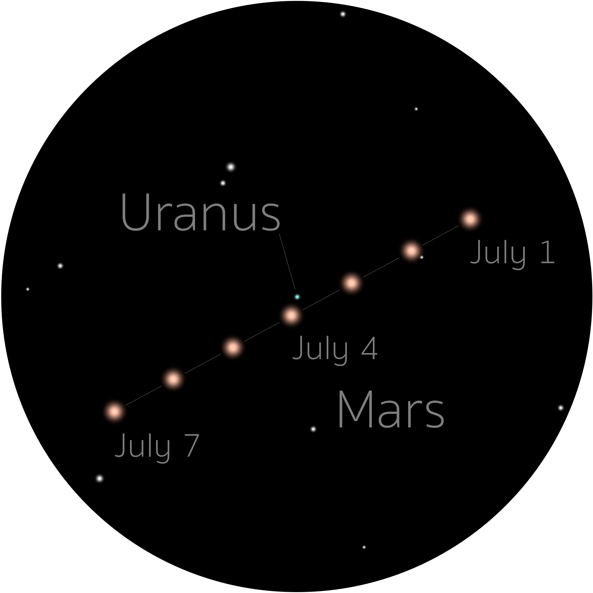 How: Find a clear view of the horizon between the east and northeast directions. You will see Mars very close to the horizon starting about 2 hours before sunrise, looking like a bright star, possibly with a slightly red hue. Once it's a little higher in the sky, but before the light of dawn starts to appear, point your binoculars or telescope at Mars and you should see Uranus in the same field of view. Note that there will be many stars of similar brightness in the same field of view, so you can use the simulation above (simulating the approximate field of view of 8x binoculars) to spot which one is Uranus. They will come very close together on July 4, at which point you could use fairly high power in your telescope, but they will spend a few days within shot of binoculars.